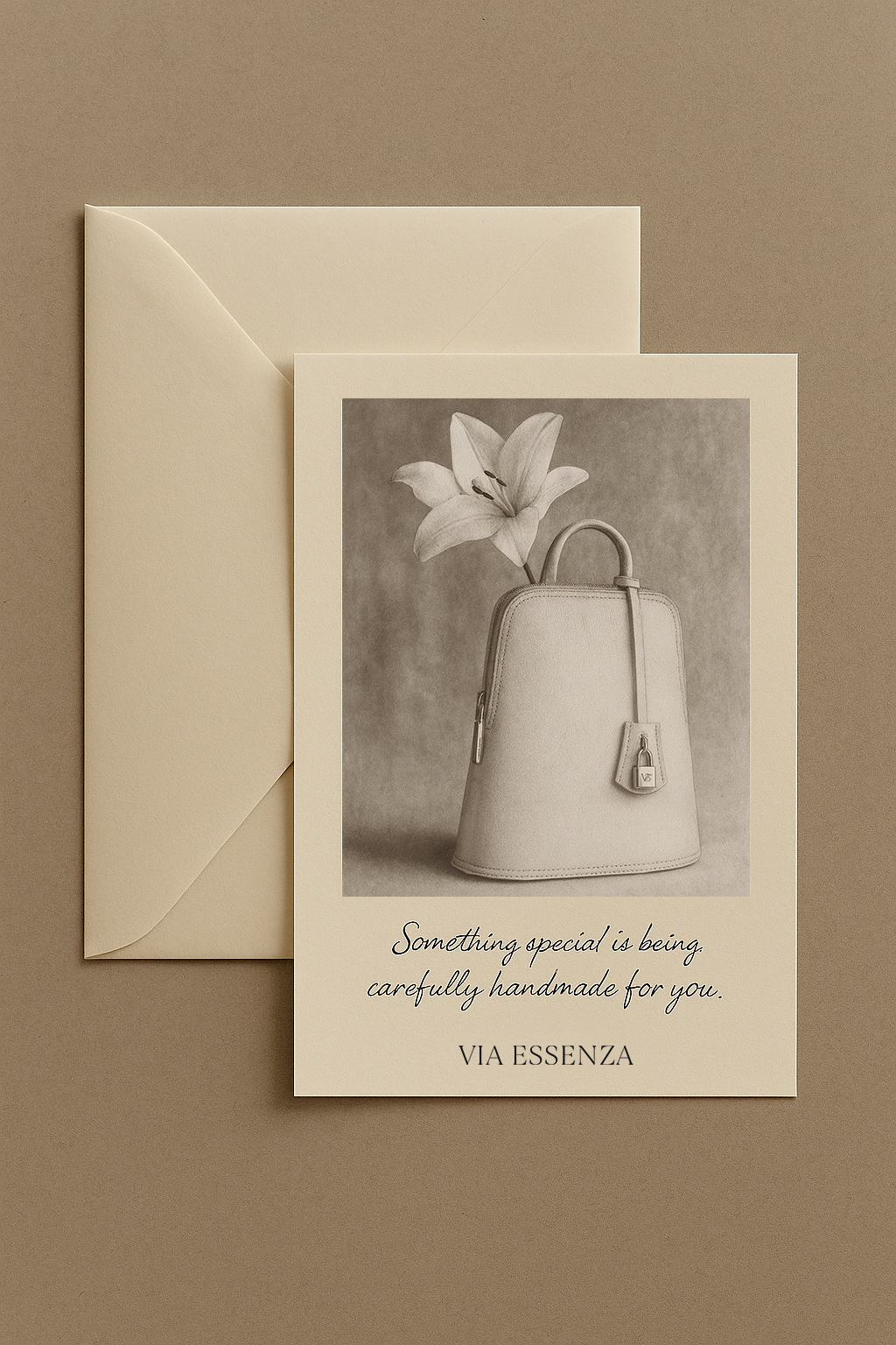Each gift card includes a beautifully printed card (pictured), enclosed in an ivory envelope, that can be offered in person or sent directly to the recipient. Inside, a quiet promise: “Something special is being carefully handmade for you.”